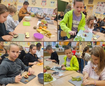 Uczniowie samodzielnie obierali owoce, kroili je i przygotowali pyszne, pełne witamin misy sałatek, które w mgnieniu oka i z wielkim smakiem zostały zjedzone. Jak wszyscy jednogłośnie stwierdzili - tak można by zaczynać każdy szkolny dzień.